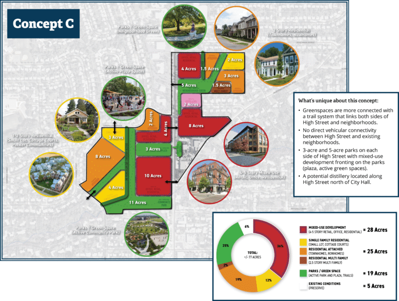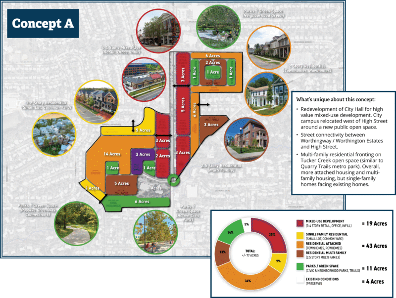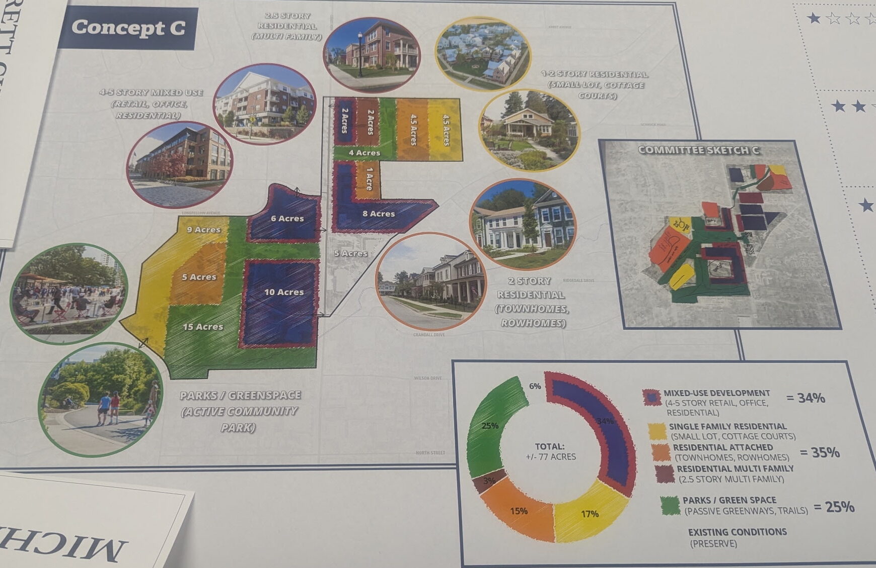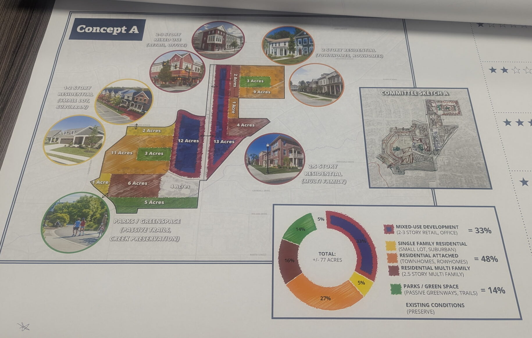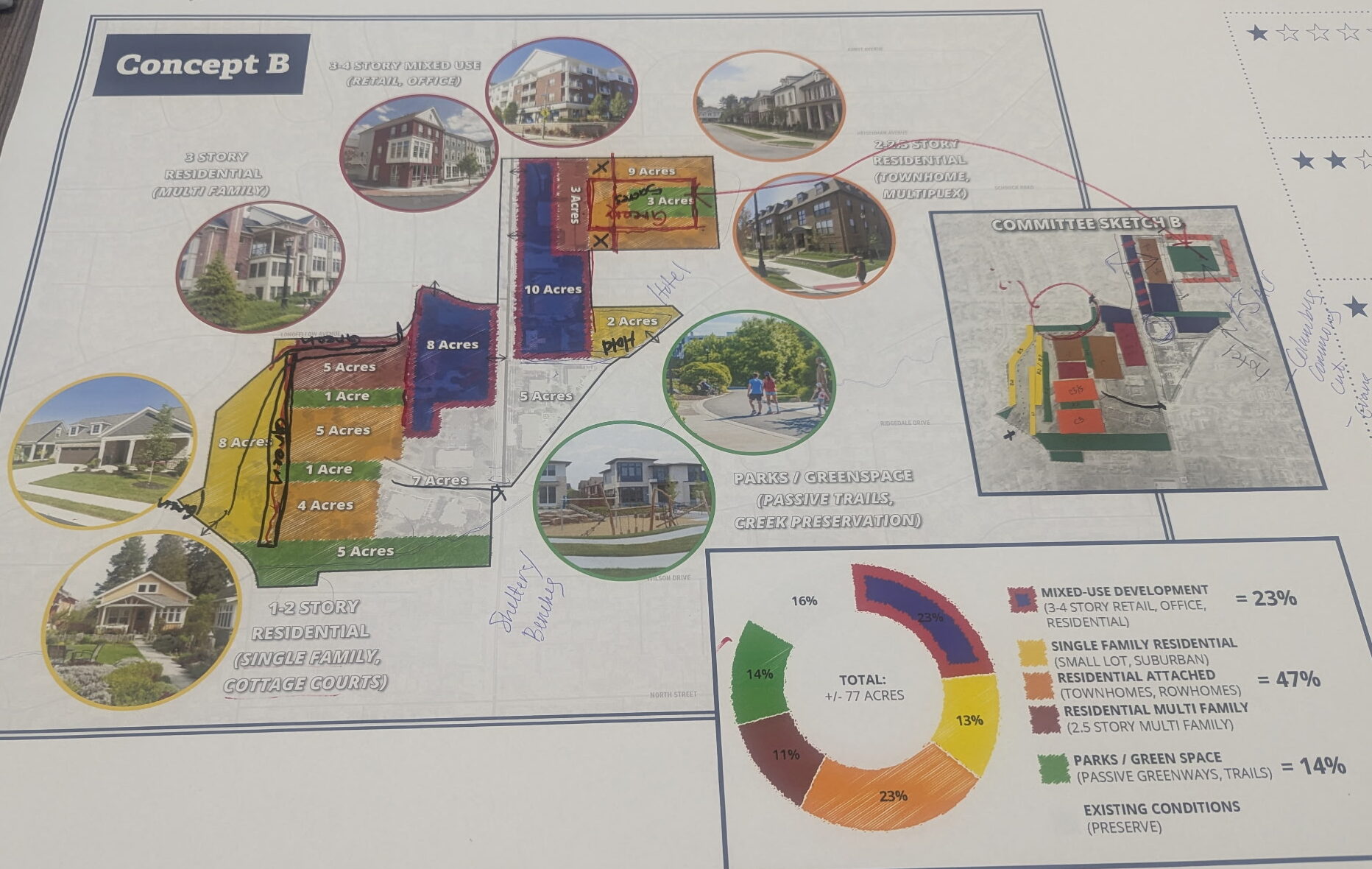 Below, the existing drafts for the three Concepts for the UMCH area, created by Planning Next for the Comprehensive Plan update committee. These, or something like these, will be presented at the Wednesday, Nov. 12, 2025 public meeting. Please note that the 5 acres of green at the south end of the UMCH property is the Tucker Creek area. This is not developable and while a natural area, should not be considered usable park land in the usual sense. More info here.